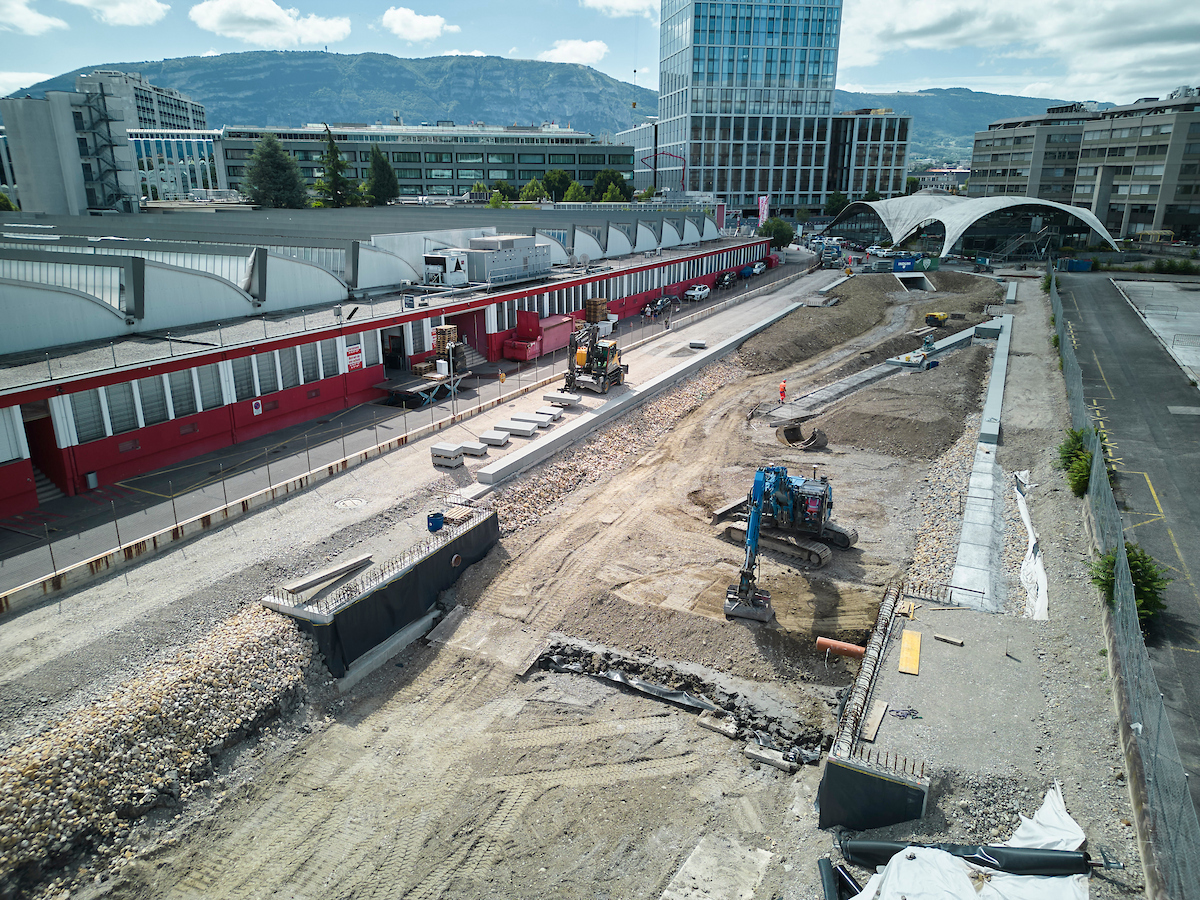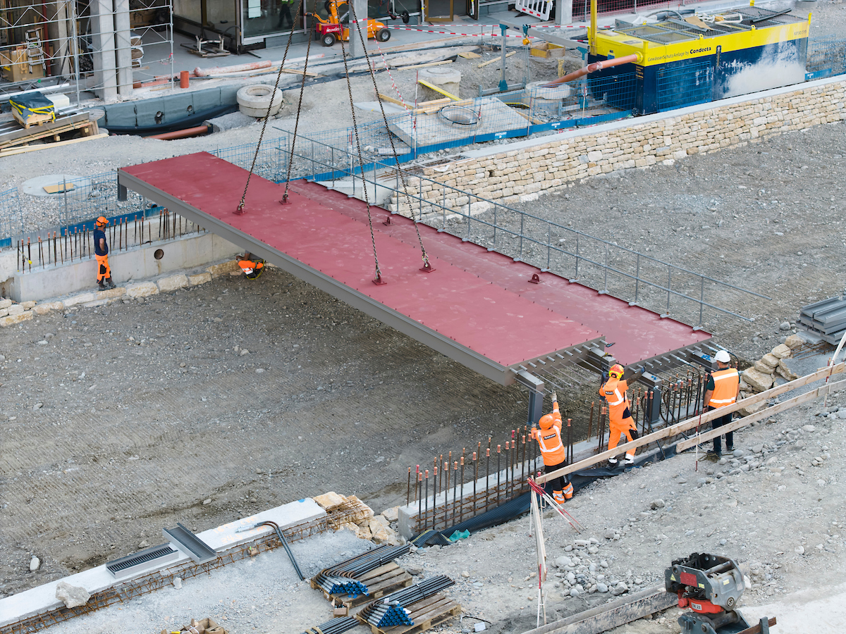 Dans le secteur de l’Etoile, la première passerelle a été posée lundi 25 août 2025. Large de 7.2 m et longue de 8 m, elle permettra aux piétons et aux cyclistes de franchir la Drize remise à ciel ouvert. Les caissons qui la composent sont en acier recyclé, fondu dans des fours à arc utilisant 100% d’énergie renouvelable. Ils ont été réalisés par Morand Constructions Métalliques, en Gruyère. L’emploi d’acier décarboné permet de réduire massivement l’empreinte CO2 des ouvrages métalliques.