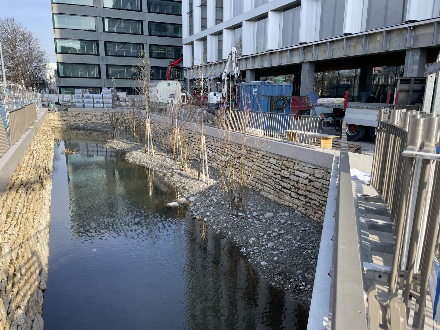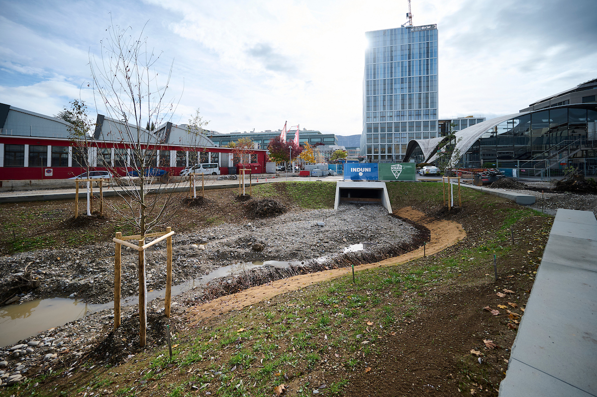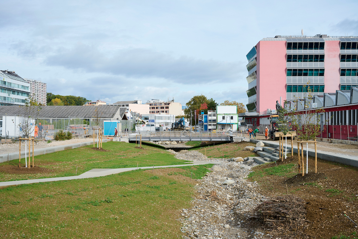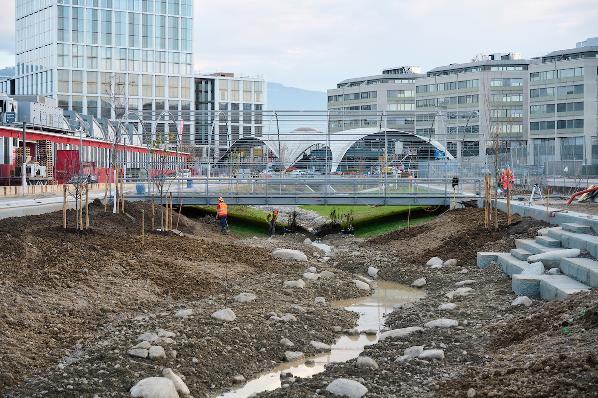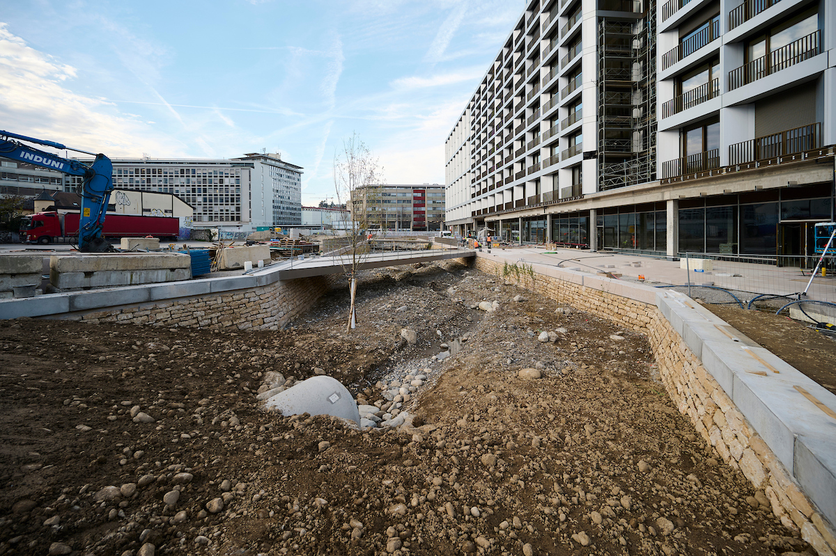Autour du bâtiment Sicli et le long de la rue Boissonnas, les travaux ont consisté en la déviation d’un collecteur d’eaux usées, la construction d’un dalot, l’aménagement du lit de la rivière et l’installation de passerelles piétonnes et cyclistes. Comme pour le secteur Etoile, ces travaux, réalisés par les entreprises Induni, Scrasa, Orllati et Sitel, se sont déroulés du printemps 2024 au printemps 2026 et la mise en eau de ce tronçon a eu lieu en novembre 2025.